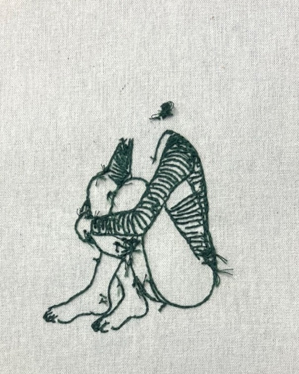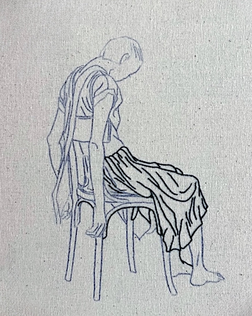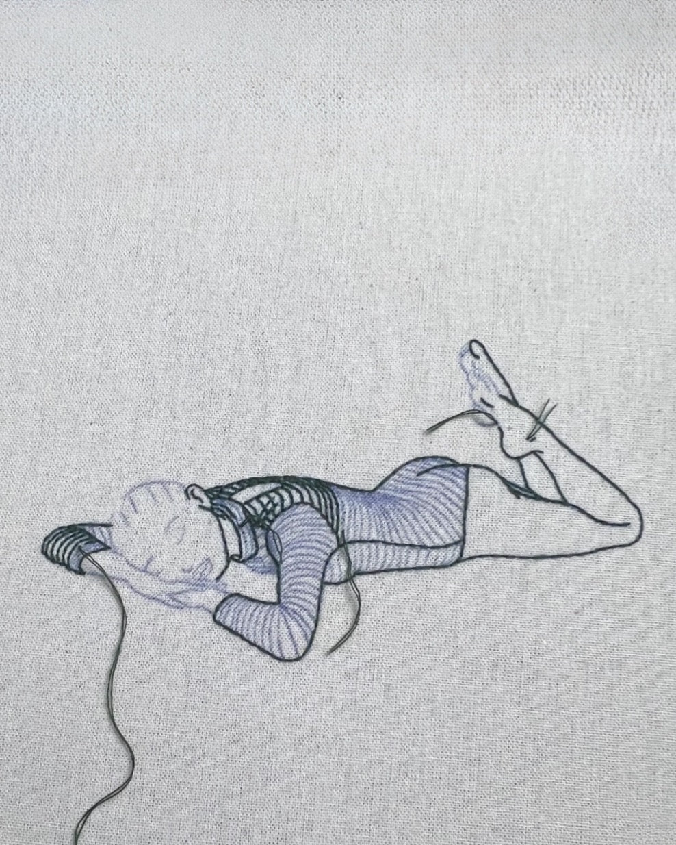 Sheena’s idea of “Working from home”, embraces her slow steady technique of embroidery, and layers of intricate emotions, each woven into melancholic poses within her subject. It is a manifesto of a quiet resistance.